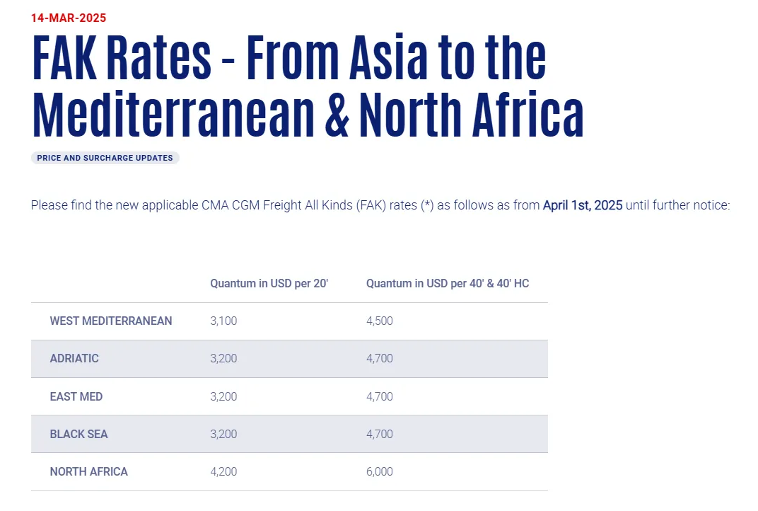 近日,達飛輪船(CMA CGM)正式發(fā)布公告,宣布自2025年4月1日起,將對所有源自亞洲主要港口、目的地為地中海及北非港口的貨物運輸實施全新的FAK(Freight All Kinds,不分貨類統(tǒng)一費率)費率體系。特別值得注意的是,針對從亞洲運往北非港口的大型集裝箱(大柜),其FAK費率將上調(diào)至6000美元。以下是此次費率調(diào)整的具體詳情: