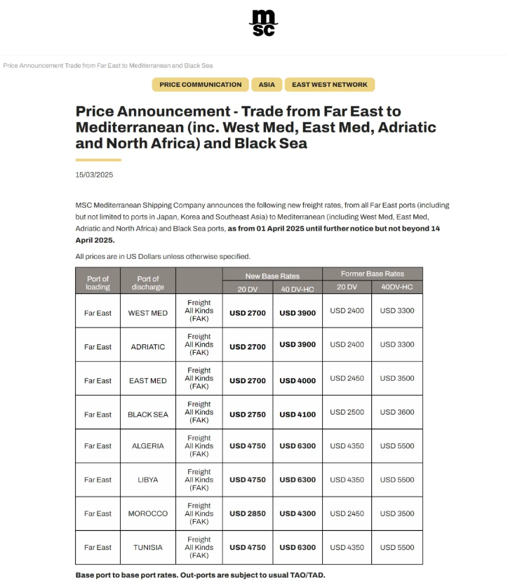 近日,地中海航運(MSC)宣布了一項新的貨運費率調(diào)整(FAK費率),該調(diào)整將適用于從所有遠東港口(涵蓋但不限于日本、韓國以及東南亞的各大港口)發(fā)往地中海區(qū)域(包括西地中海、東地中海、亞得里亞海以及北非港口)和黑海港口的所有航線。此費率調(diào)整計劃自2025年4月1日起正式生效,并將持續(xù)至不晚于2025年4月14日。具體而言,小型集裝箱(小柜)的最高運費將上調(diào)400美元,而大型集裝箱(大柜)的最高運費則將增加800美元。以下是此次費率調(diào)整的詳細情況: