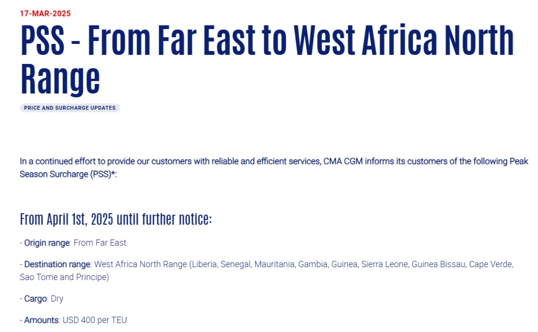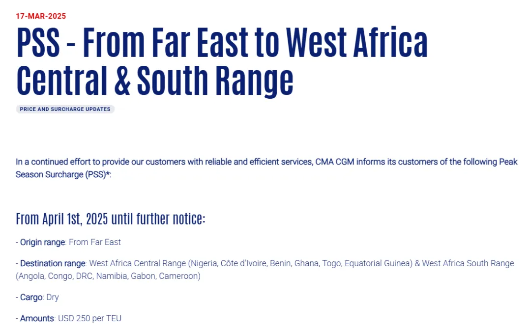 此外,達飛輪船(CMA CGM)再次發(fā)布重要公告,宣布自2025年4月1日起,將對特定航線征收旺季附加費(PSS),直至另行通知。具體調(diào)整內(nèi)容如下: