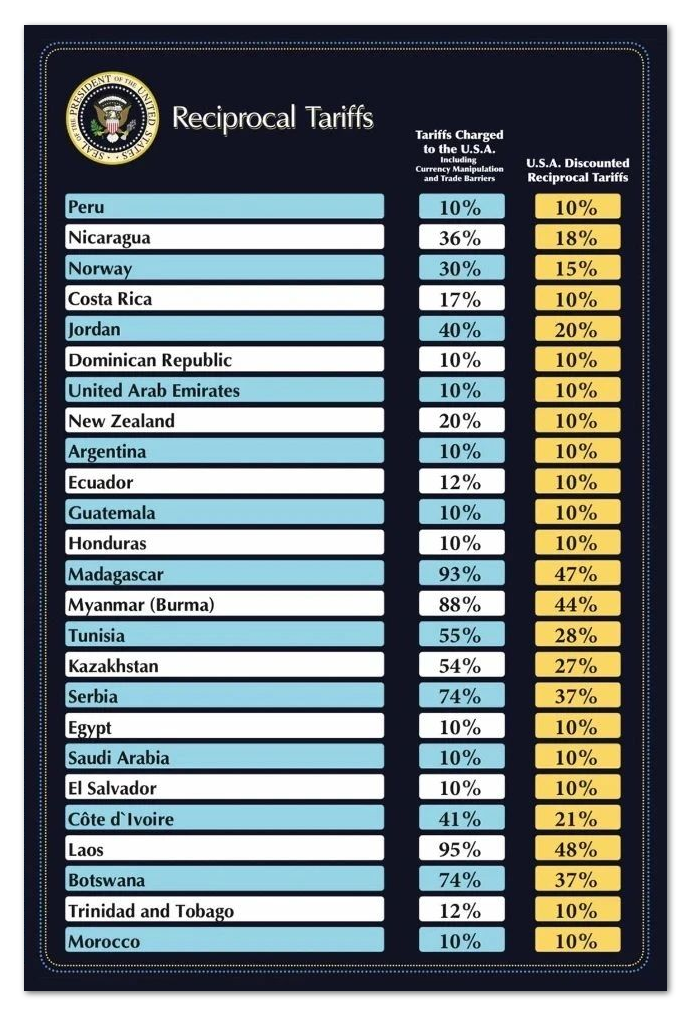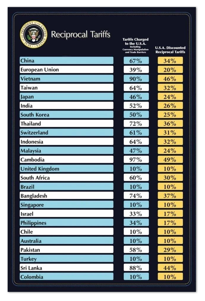 另外,在這次直播講話中,特朗普還講到:美國將對所有進口商品實施一個10%的基準關稅稅率,作為“對等關稅”計劃的基礎。并且他指出,對于與美國存在高額貿易逆差的數十個國家,將征收更高的關稅。簡而言之就是,針對不同國家和地區(qū),美國將實施不同的“對等關稅”稅率。具體如下: