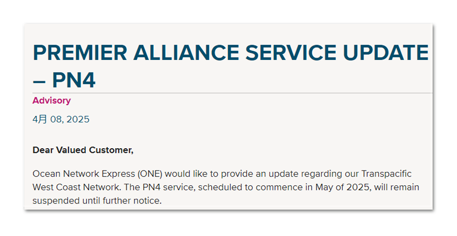 因“對等關(guān)稅”的影響,ONE宣布暫停于5月運營的跨太航線PN4的計劃!
